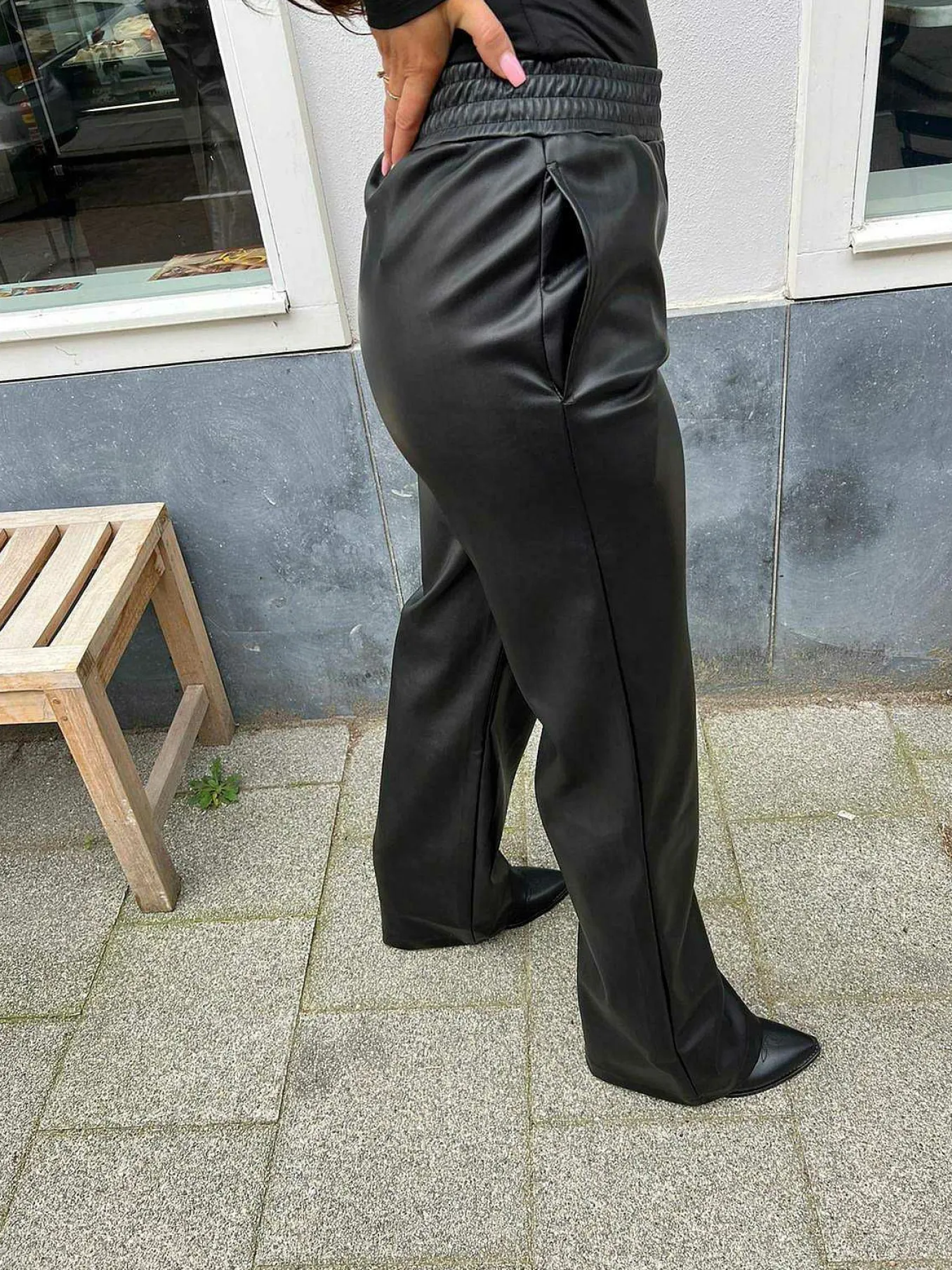 Stoere Pu Broek Met Zakken, Een Langer Model En Een Elastieke Band.