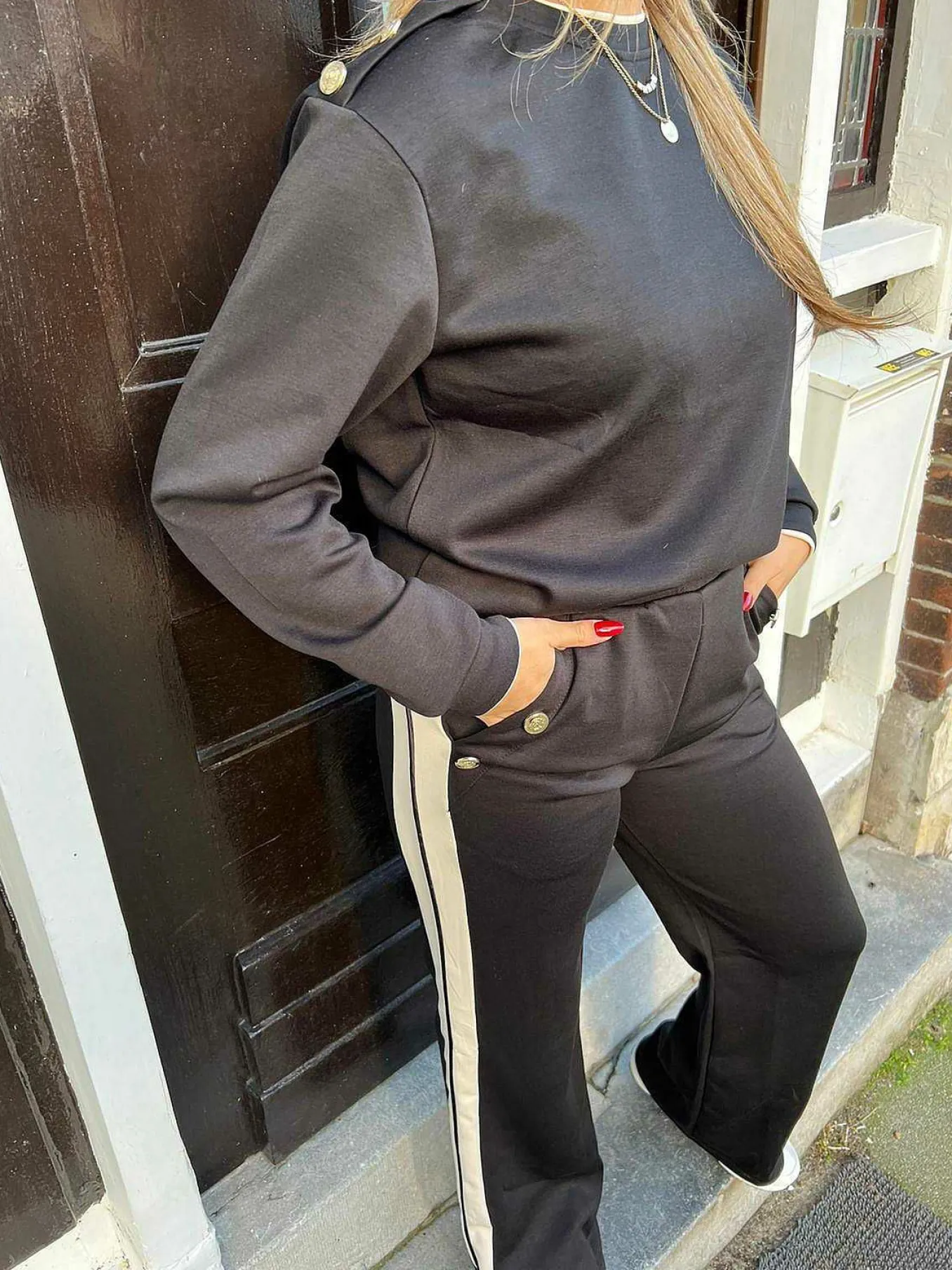 Hoe Tof Is Dit Pak? Wij Zijn Er Weg Van! Het Pak Heeft Gouden Knopen En De Broek Heeft Een Elastieken Band In De Middel. De Trui Heeft 1 Open Schouder. Verkrijgbaar In Meerdere Kleuren.