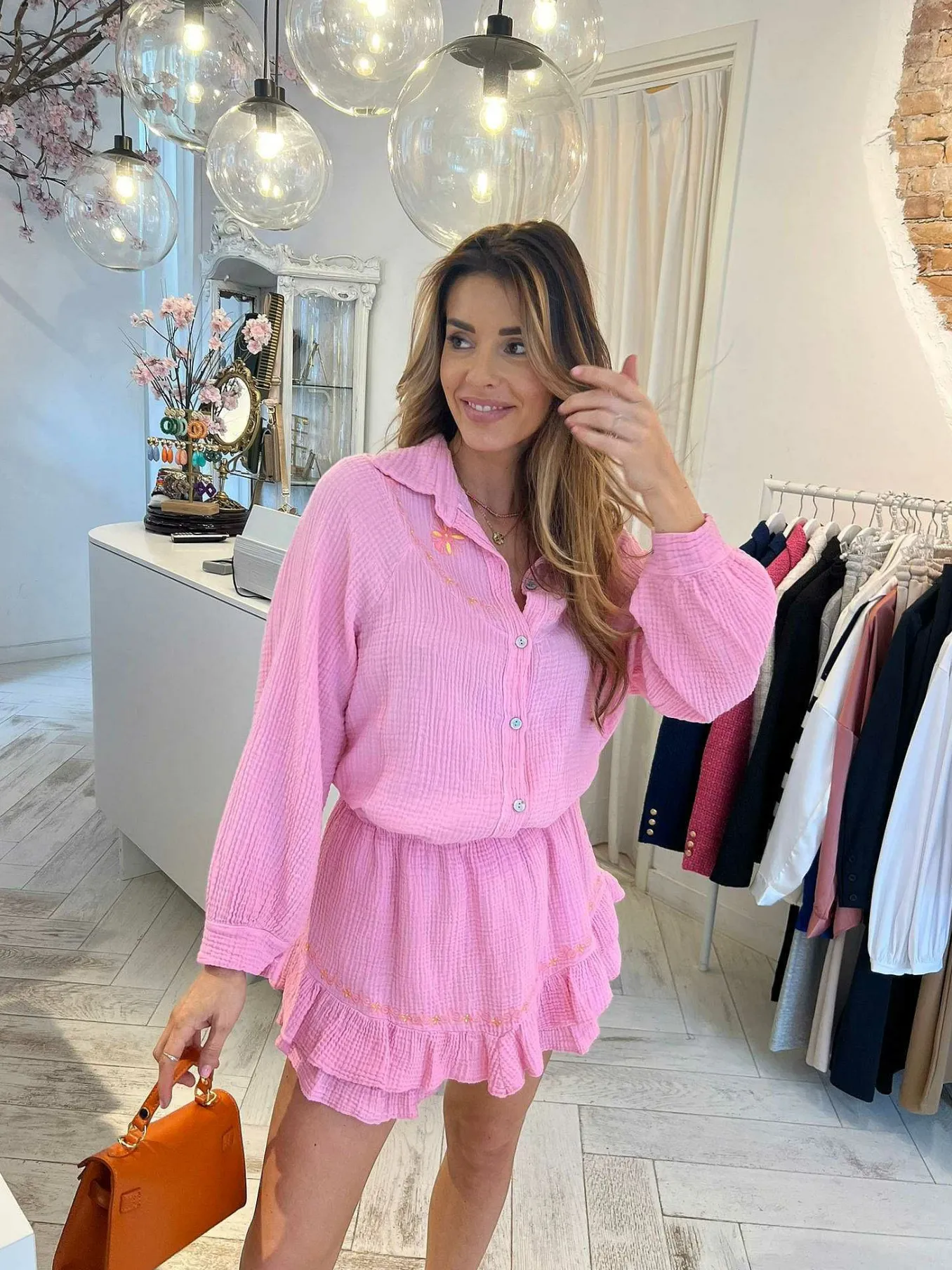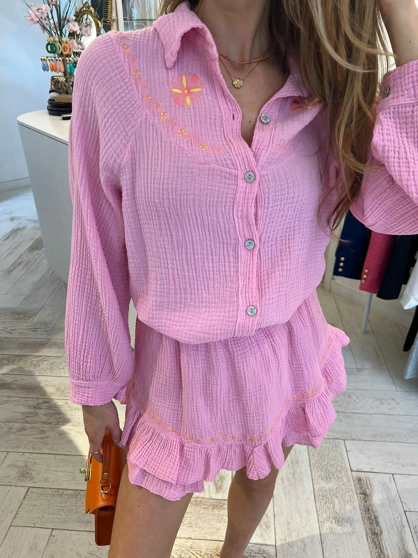 Deze Mousseline 2 Delig Set Met Geborduurde Opdruk Is Super Leuk Voor De Zomer. Het Rokje Heeft Er Een Broekje Onder Zitten. Verkrijgbaar In Meerdere Kleuren.