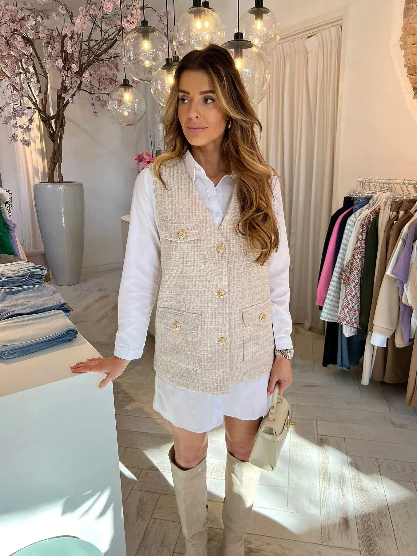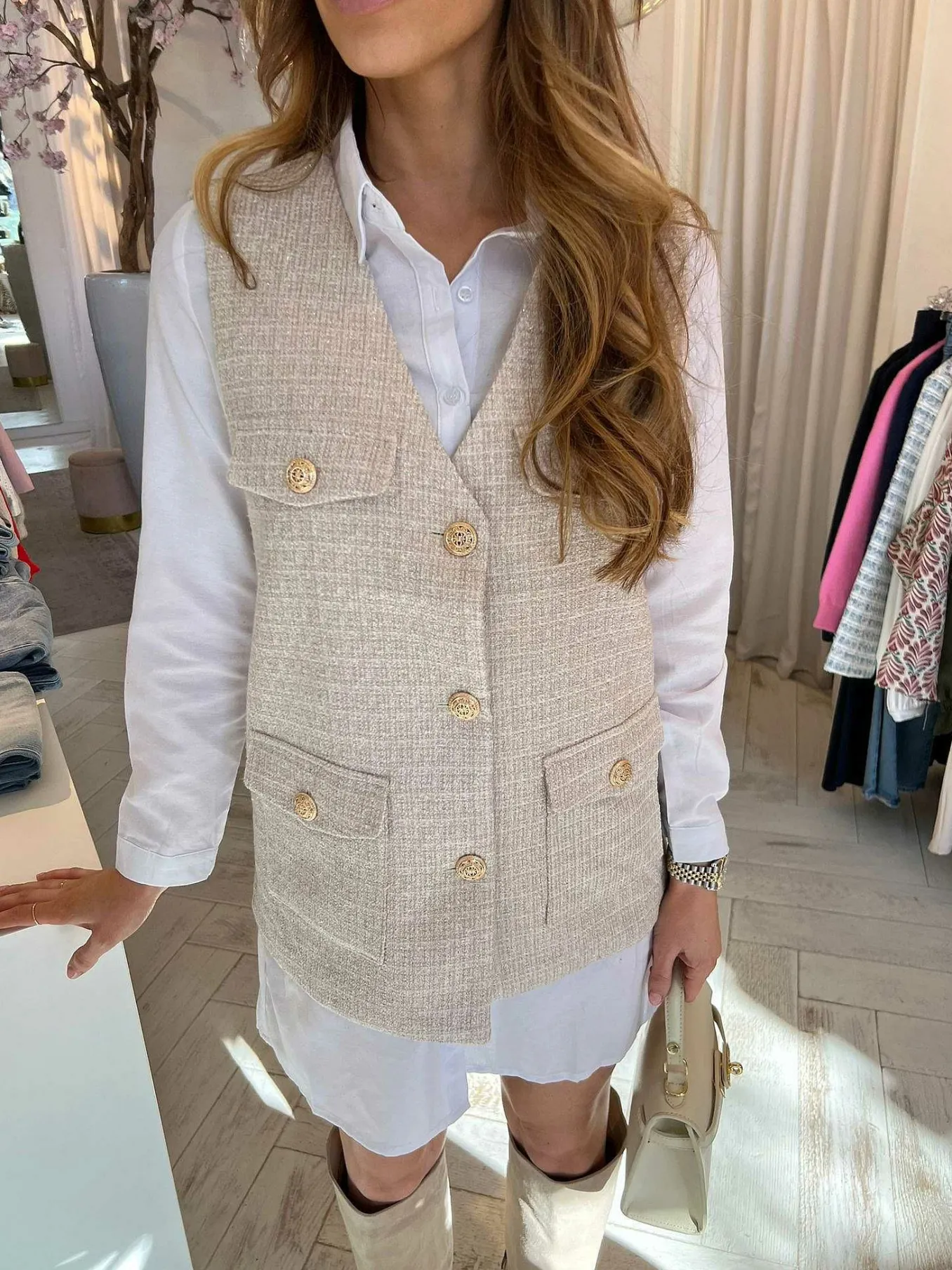 Dit Mooie Lange Gilet Heeft Een Klein Lurex Draadje En 3 Gouden Knopen Aan De Voorkant. Verkrijgbaar In Meerdere Kleuren.