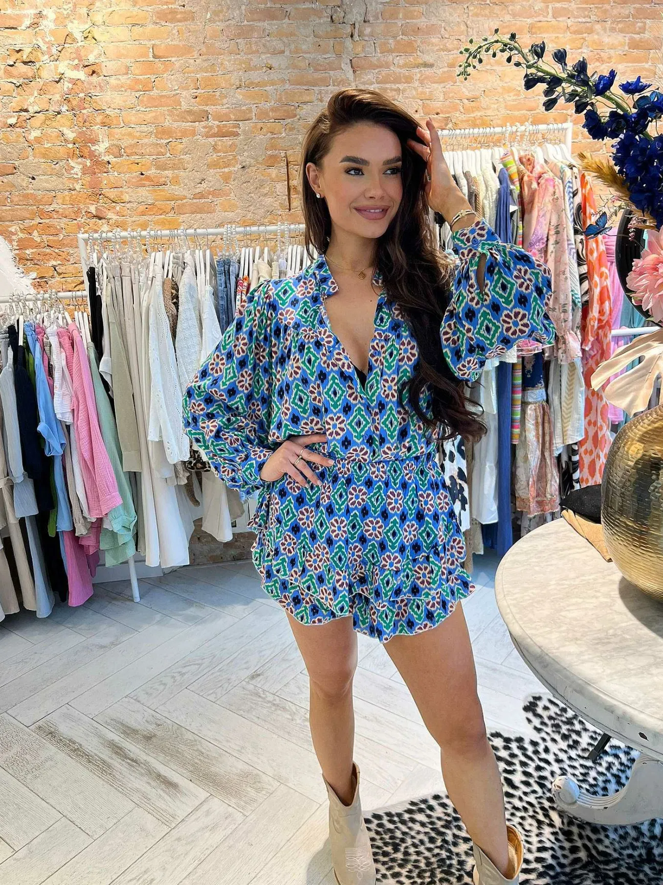 Deze Mooie Set Heeft Een Mooi Printje En Loopt In Een V-Hals Met Daaronder Knoopjes. De Mouwtjes Kunnen Makkelijk Omgeslagen Worden. Het Rokje Heeft Een Leuke Ruffle Met Daar Onder Een Broekje Aan Vast Gemaakt. Verkrijgbaar In Meerdere Kleuren.