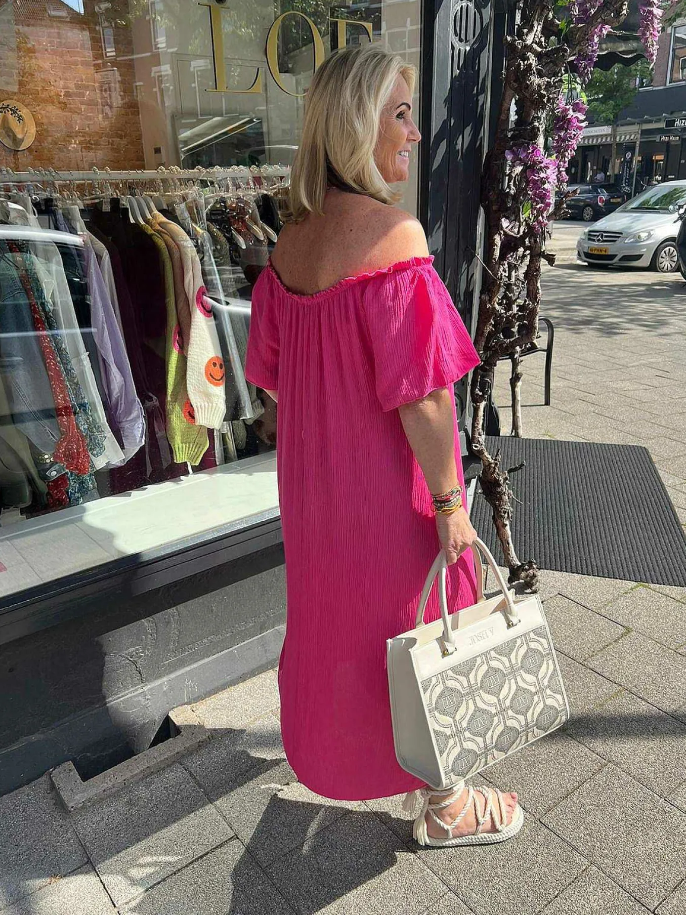 Heerlijke Off Shoulder Jurk Met Een Glitter In De Stof En Ruffle Details. Verkrijgbaar In Verschillende Kleuren.