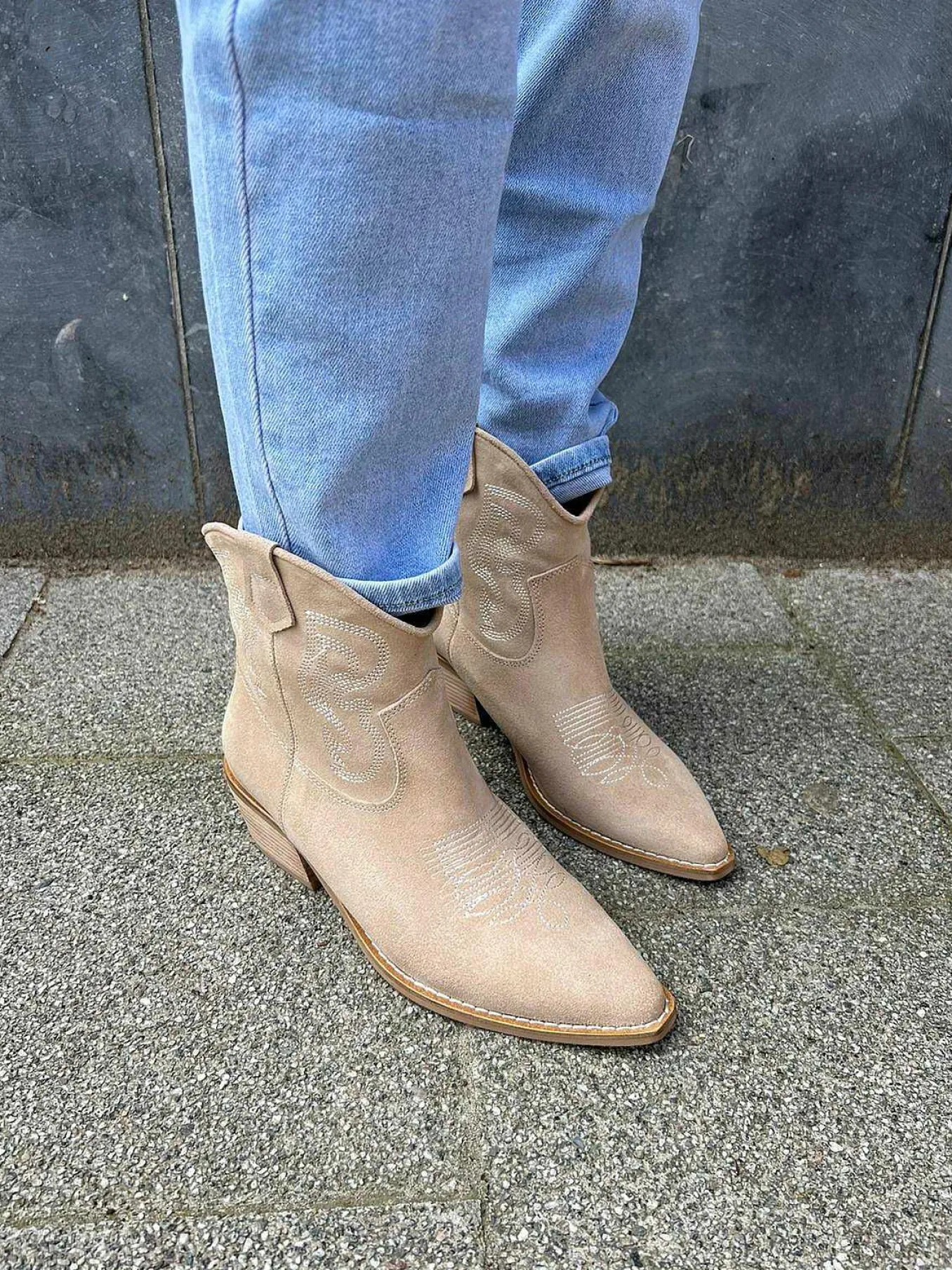 Hoe Leuk Zijn Deze Lage Suède Western Boots! Ze Hebben Een Opvallend Stiksel Patroon. Dit Is Een City Western Laarsje Echt De Trend Van Dit Seizoen. Draag Deze Enkellaarsjes Met Een Jeans Voor Een Stoere Look Of Onder Een Rokje/Jurk Voor Fashionable Uiterlijk.