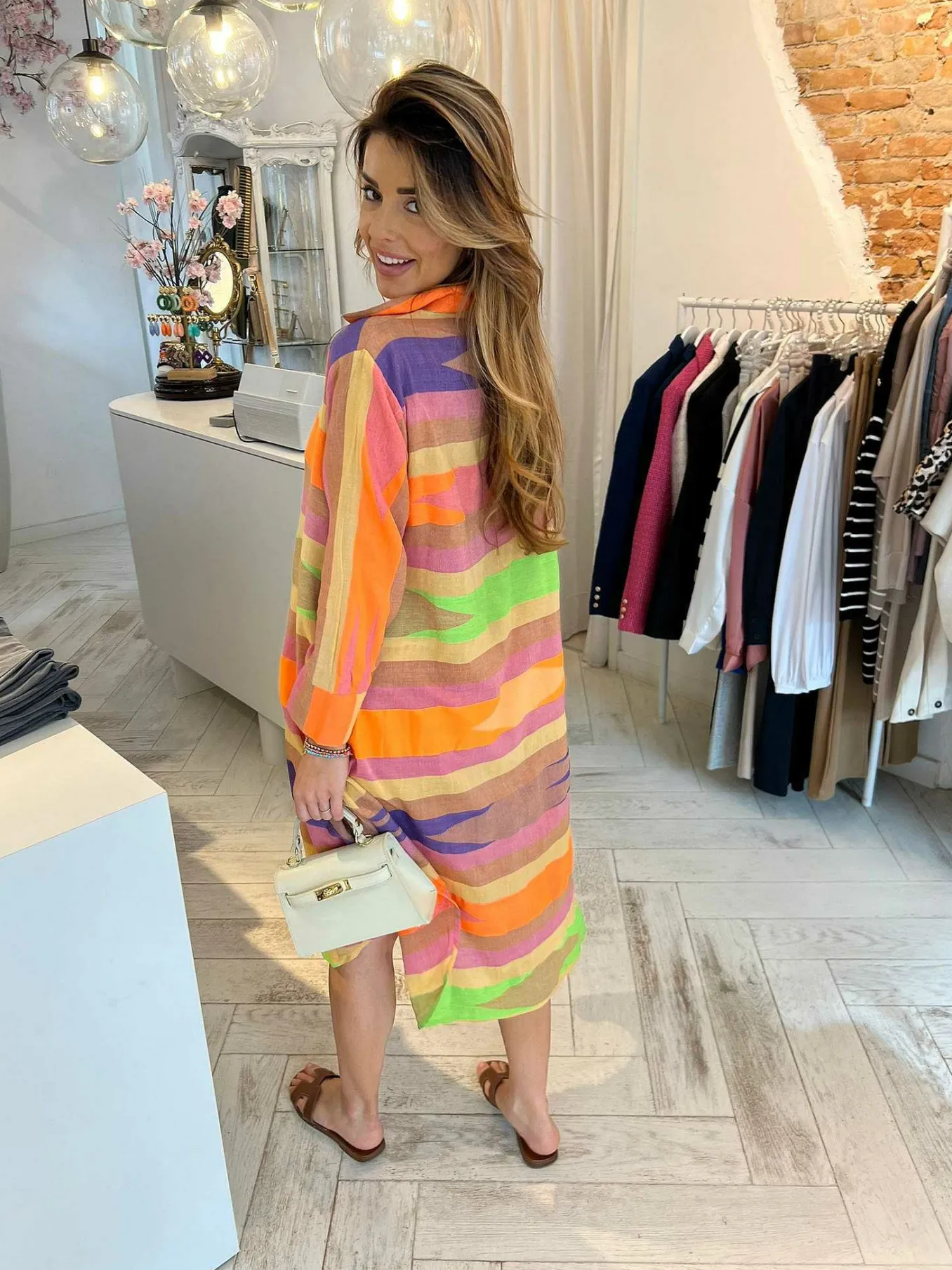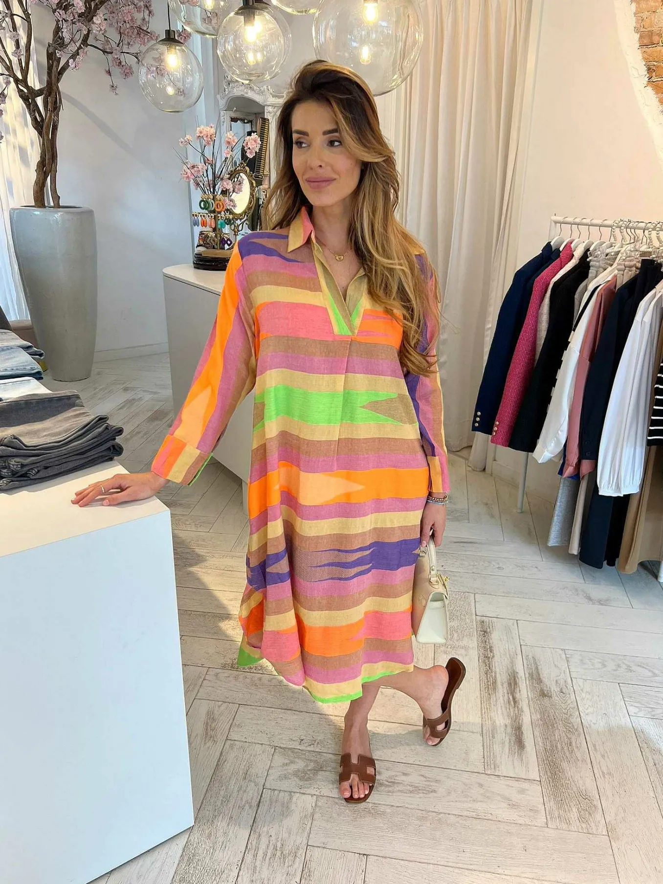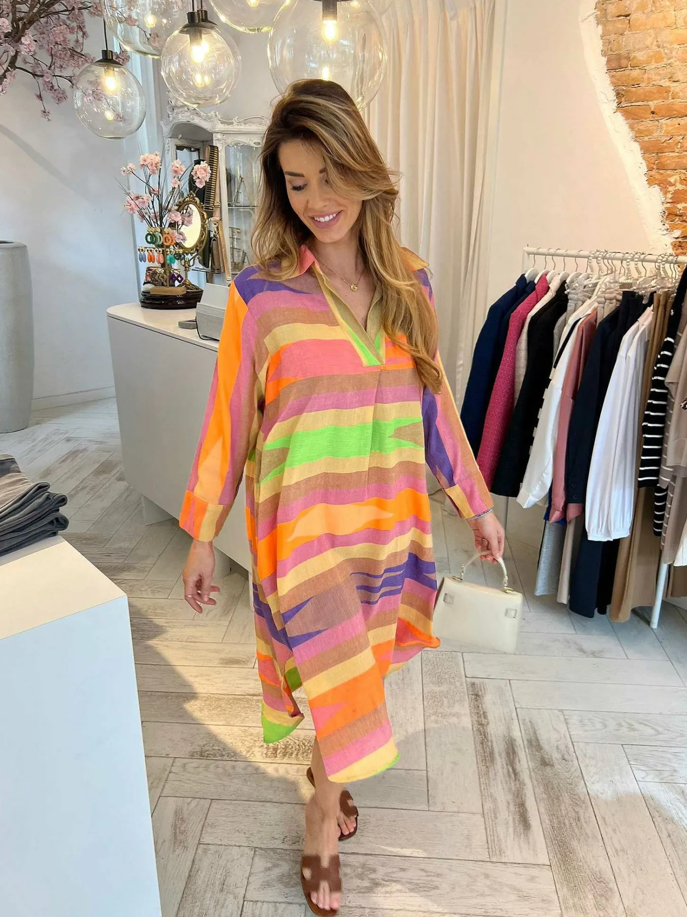 Deze Heerlijke En Vrolijke Strandjurk Is Lekker Luchtig, De Jurk Heeft Een Kraagje En Een V- Hals.