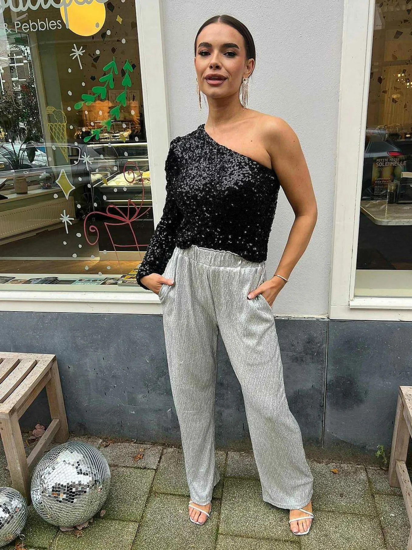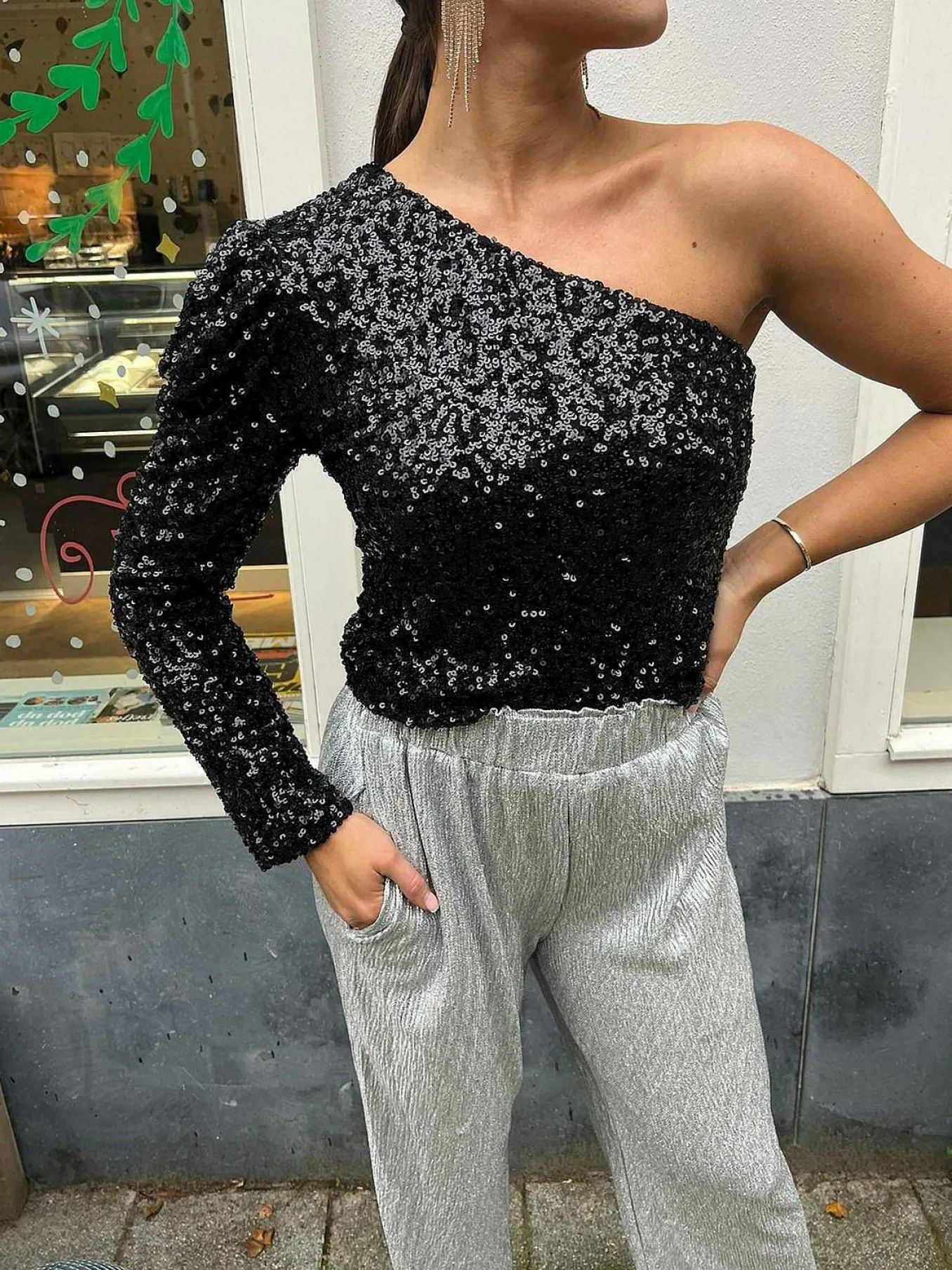 Prachtige Top Met Pailletjes En 1 Lange Mouw. Verkrijgbaar In Verschillende Kleuren.