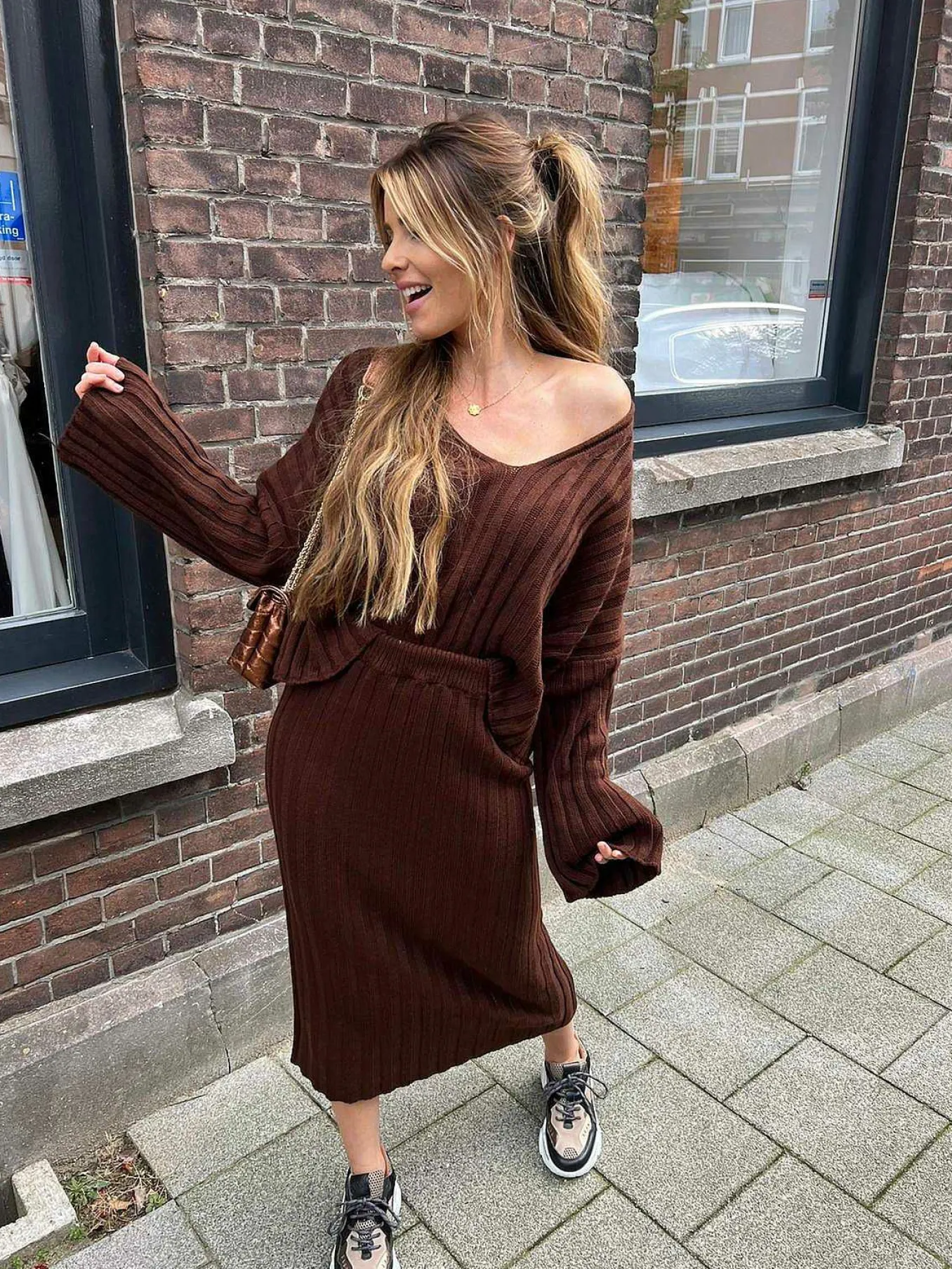 Leuke Ribbed Set Met Een Sweater En Bijpassende Midi Rok Met Splitjes.Materiaal: 100% AcrylWas Advies: Zie Label In Het …